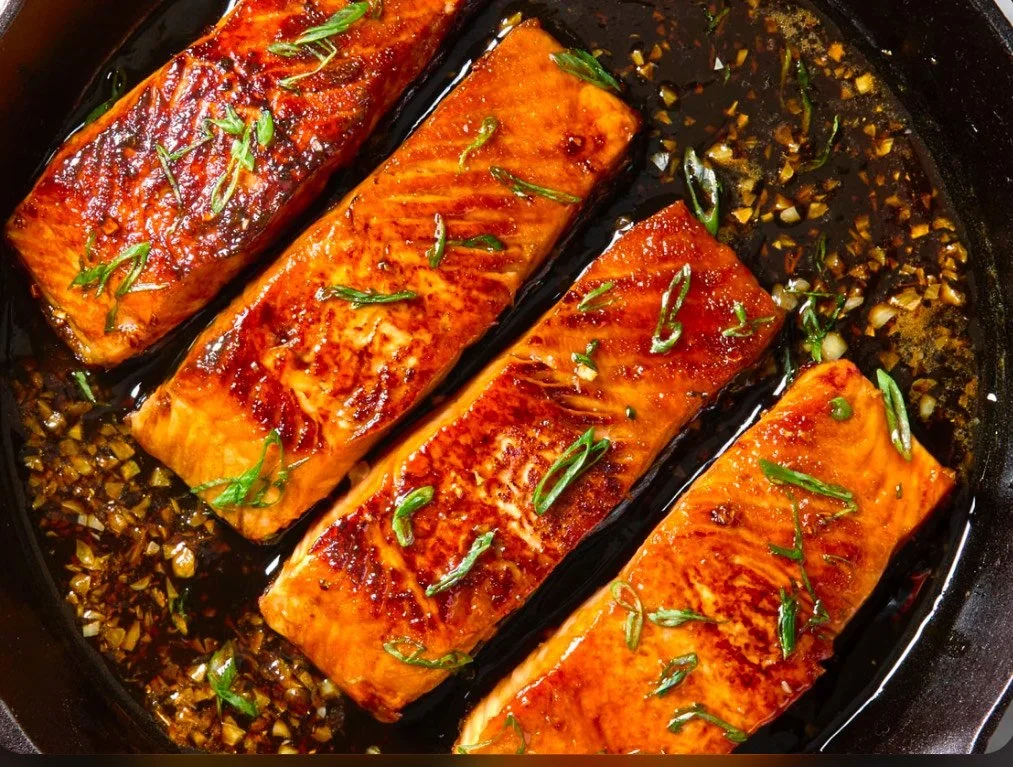 Tender glazed salmon with a rich apricot-shallot finish, served over fragrant almond rice with bright, roasted asparagus on the side.