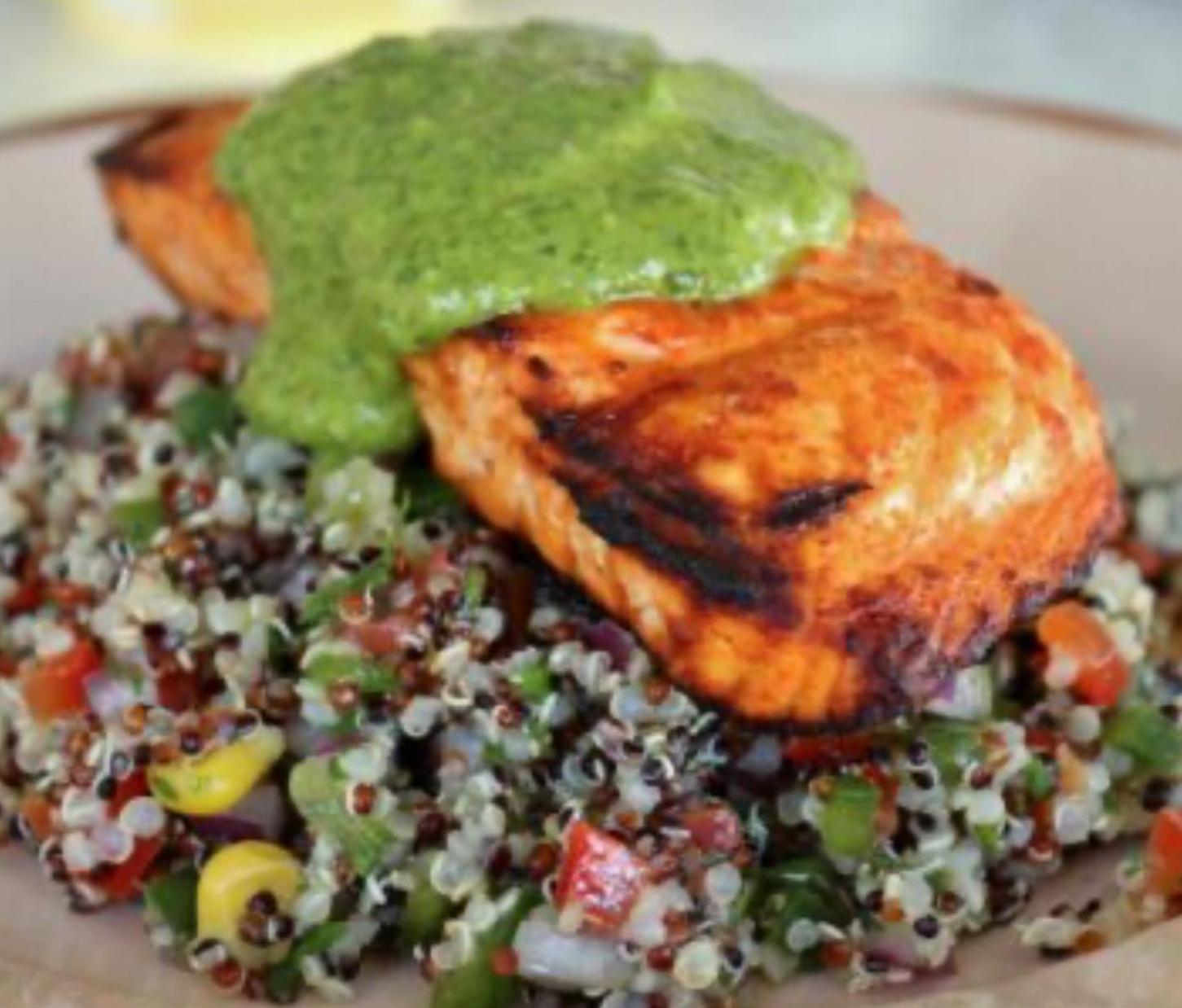 Wild-caught salmon served over tri-color quinoa with tender baby kale, sweet dried cherries, and finished with a fresh basil pesto. (Gluten Free)*Contains pine nuts